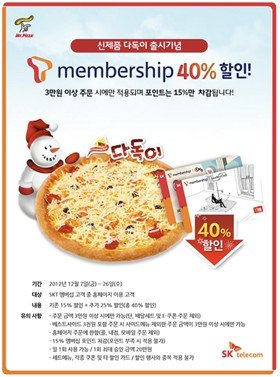 홈페이지에서 피자 3만원 이상 주문 시 SKT 40% 할인 (차감은 15%)
