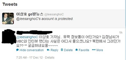 네이트에서 이상호 go발뉴스에대한 기사 (MBC의 김정남 인터뷰)를 보고 트위터에 들어가 이상호씨께 글을 남겼습니다.