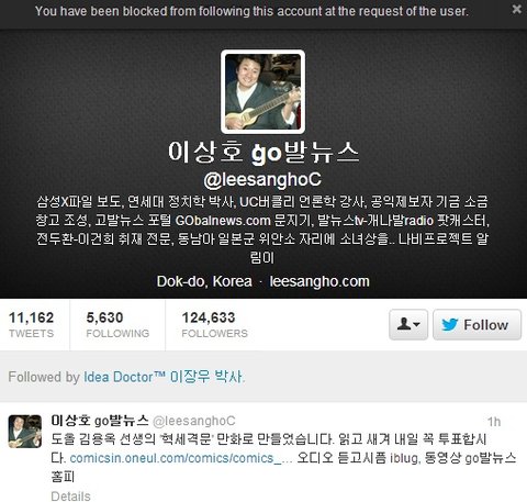 한두시간 후에 트위터 확인을 해 보니, 이상호씨가 제 계정을 차단 시킨겁니다! -_-;