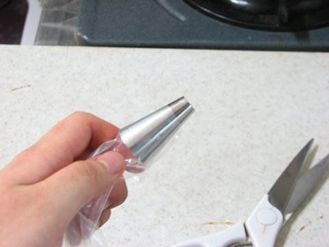 역삼각형 모양의 짤주머니 중, 끄트머리를 약 3-4cm가량 잘라낸 뒤, 원하시는 깍지를 끼우시면 되어요.