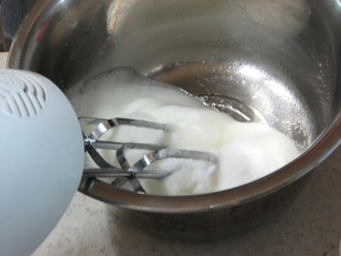 2. 중량의 설탕을 1/2정도 넣고 계속 거품내 주세요.