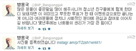 B.A.P 방용국이 투표 인증샷을 게재하며 '개념 아이돌'로 떠올랐다.