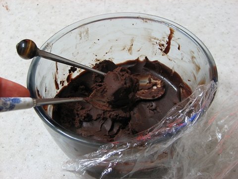 그 후, 뜨거운 가나슈의 김을 뺀 뒤 가나슈에 착 달라붙도록 랩을 씌우고