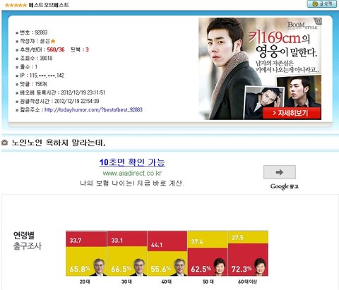 오늘의유머라는 사이트입니다. 제가 이제 20살되서 첫 투표를 하고 여러 사이트를 돌아다녀봤습니다. 일베란곳은 당연히 좋아하고, 타 사이트(MLB 파크, 뽐뿌...등)들은 썩 안좋아합니다. 이해합니다 자신이 지지하던 대통령이 뽑히질 않았으니...