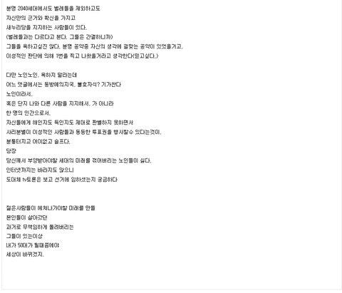 나라에 똥을싸놓고 간다느니, 노인이 아니라 노예라느니, 70대이상 노인분들은 이성적으로 투표를 못한다느니...... 정말 저게 제정신인 사이트인가요?