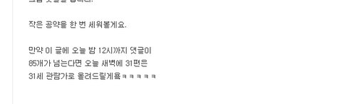 만약 이 글에 오늘 밤 12시까지 댓글이85개가 넘는다면 오늘 새벽에 31편은31세 관람가로 올려드릴게욬ㅋㅋㅋㅋㅋ