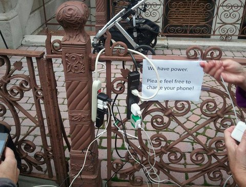 "우린 전기가 들어와요. 원하면 핸드폰을 충전 하세요!"