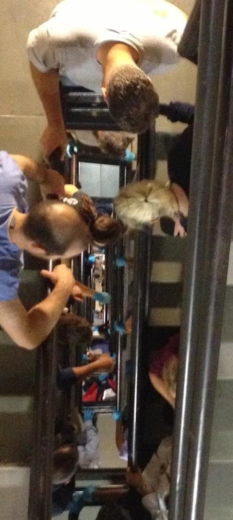 병원 직원들이 13층 계단에 나란히 줄 서 예비 발전 전동기를 운반하고 있다.