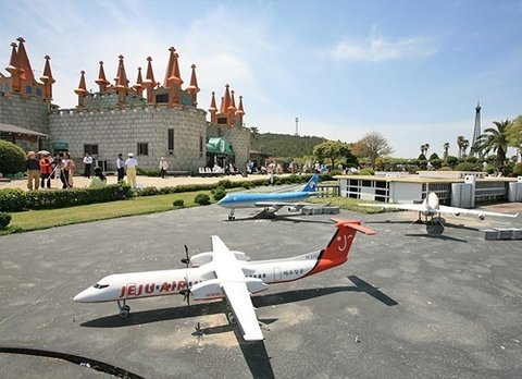 위에 보시는 사진이 제주국제공항을 축소해 놓은 미니어처랍니다. 매우 흡사하게 생겨 놀랬습니다. 제주도 관광지 소인국테마파크에서 미니어처를 만드는 사람에게서 장인정신이 느껴질 정도..제주국제공항 활주로에 제주항공과 대한항공의 여객기가 이륙을 앞두고 대기중이네요. 그 뒤로는 궁전과 에펠탑이 보이는군요.
