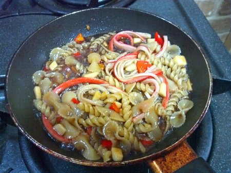 각종 야채와 삶은 파스타 그리고 게맛살님을