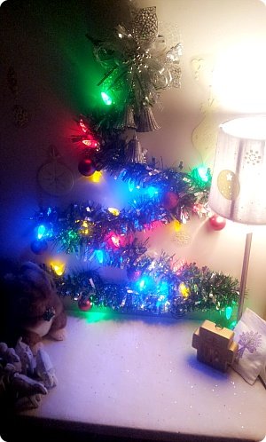 가짜눈 찢어서 대충 붙여주고 벽이랑 스텐드 위에 야광으로 된 크리스마스 소품모양 붙이기!