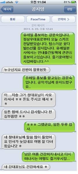 이 역시 거짓말입니다. 위와 같이 문자를 교환한 시점은 2011년 8월 23일 이었고, 그 내용에서도 공지영은 처음엔 누군지 몰랐다가 곧 “정대표님께 말씀 많이 들었다”고 하며 "인사가 늦었네요, (6월에 4명이 유레일의 협찬으로 약 3주간 7개국 20여 도시) 여행 잘 다녀왔습니닷"하고 언급할만큼 유레일의 후원과 홍보사의 존재를 잘 알고 있었습니다. 이어서 저는 추가로 제공한 유레일 패스를 갖고 "다시 떠나시는 여행도 즐거우시길"이라고 인사했던 겁니다. <다음 글에 계속>