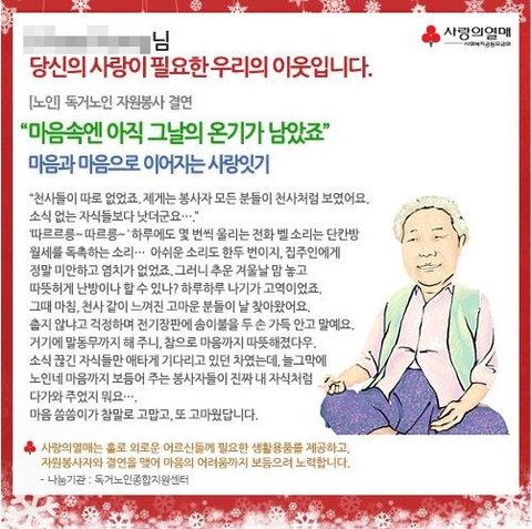 저는 독거노인의 사연이 나왔는데 왠지 가슴이 찡하더라구요.