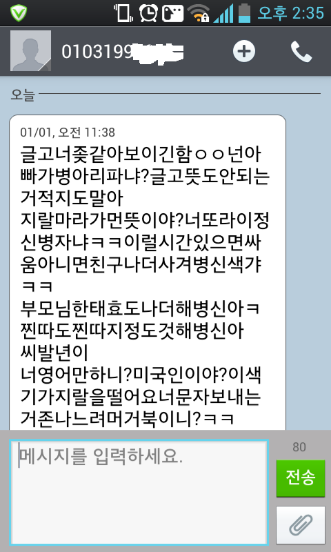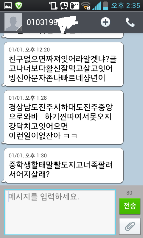 저는 저 나름대로 충고를 해줬을 뿐인데 말이죠... 그리고 욕설 문자 계속 날라 오길래 참고 기다렸다가 심하길래 답장을 보냈습니다. 하지만 돌아오는 답변은 이거더군요/.....