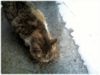 몸은 고단하고 졸음이 밀려오지만 길냥이에게 밥을 주는 일을 거를 수는 없습니다. 터덜터덜 눈길을 걸어 길냥이가 있는 골목으로 가보니 오늘은 녀석이 먼저 와서 기다리고 있습니다. 어제 밥을 먹지 못해서 배가 많이 고팠나 봅니다. 저를 보자마자 얼른 밥을 달라고 빙글빙글 돌면서 시위를 합니다.