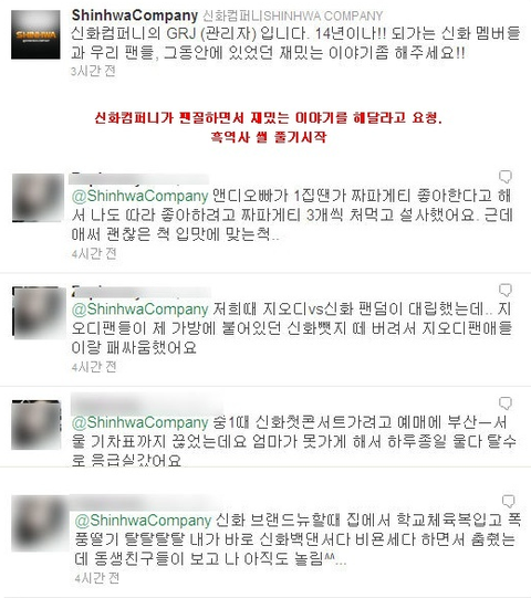 6. 어느날 신창분들이랑 지오디 팬들이랑 싸워서 팬지(지오디팬)분들이 이기심 지오디는 팬지분들한테 "싸우지마세요ㅠㅠ"이랬는데 신화반응 "이겼어?졌어??아 왜졌어!!!!!!!"그럼그럼 싸움은 이겨야짘ㅋㅋㅋㅋ