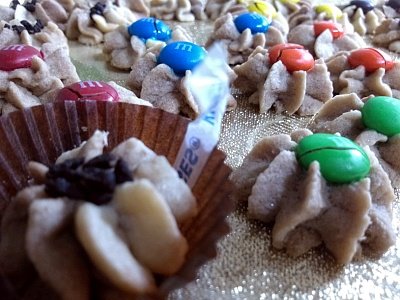 땅콩버터쿠키반죽을 별깍지로 짜주고, 엠앤엠과 크런치를얹어 구웠어요