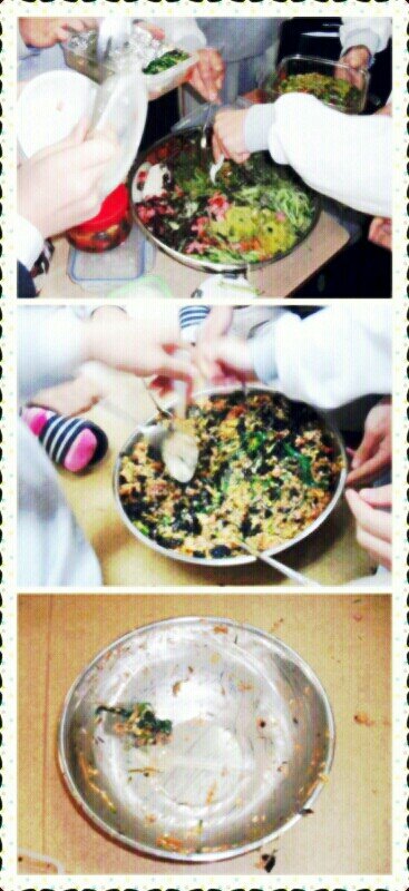4교시 종이 치자마자 평소라면 급식실으로 달려갔겠지만우리는 여유롭게 사물함 문을열어서 도시락을 꺼냄ㅋ그리고 양푼에다 부음총11명의 여자아이들이였음얘들이 원래 지들먹는 양보다 더 많이 가져와서 다먹을수있을까 걱정했지만김가루 솔솔뿌려서 남김없이 다먹음다른반남자얘들이 와서 한입만 먹어보자고 쫄랐지만꺼졍...다우리꺼야 우걱우걱 라는 포스를 보이며 다먹음
