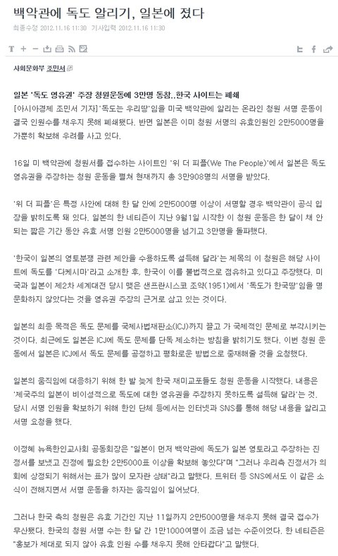 미국정부 백악관 우리의 진정서 인터넷https://petitions.whitehouse.gov/ 에는 12월 12일 현재 38개의 외교 문제에 관 진정서가 올라와 있는데 그중 세 개는 친일/반한국 진정서 입니다. 이중의 하나가 독도에 관한것이데 다음과 같습니다.