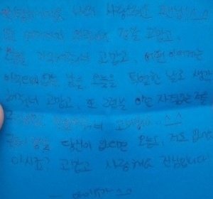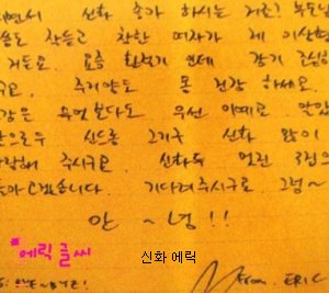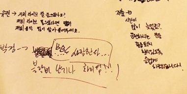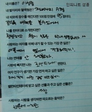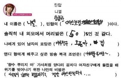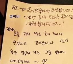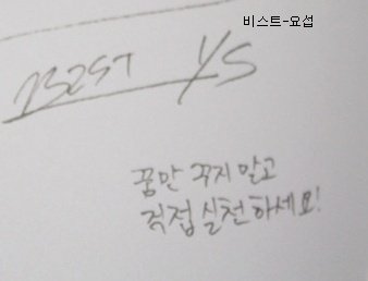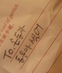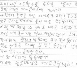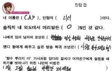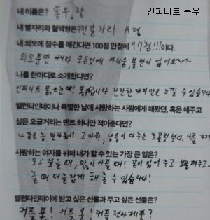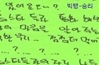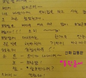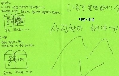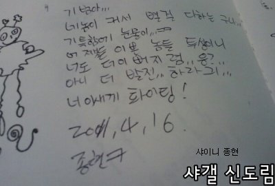 오빠의 글씨는 참 읽기 힘들지만, 악필인'편'이라 그림도 못 그리지만, 총쏘면서 뛰어가는 연기도 못하지만, .....코..가 좀 작지만.. 그래도 괜찮아요 오빤 애니빵도 잘 하고 닭발꼴뚜기 포인도 잘 하고 브리핑도 잘 하니까 괜찮아요*^^*ㅋㅋㅋㅋ (사실은 잘생겼고 키도 크고 비율 좋고 노래도 잘 하니까?ㅎ)