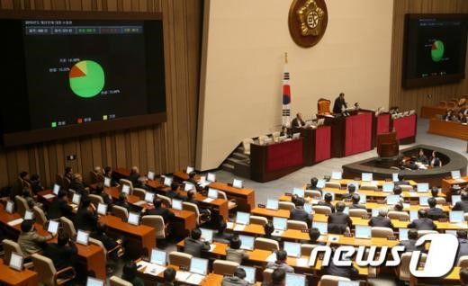 1일 새벽 서울 여의도 국회의사당에서 2013년 예산안 처리를 위해 열린 본회의에서 예산안이 재석 의원 273명중 찬성 202명, 반대 41명, 기권 30명으로 가결 처리되고 있다. (서울=뉴스1) 양동욱 기자