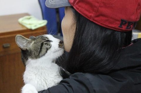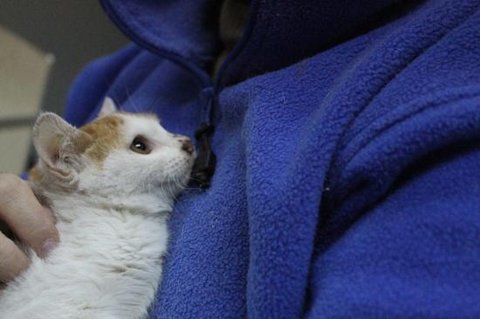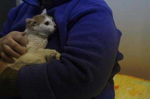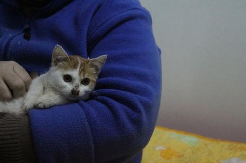 엄마품이 그리운 아이랍니다. 어미와 떨어져 많이 울었죠... 이리 안으면 잠잠해지고... 현재는 울음은 그쳤으나 아직도 겁이 많고 엄마를 찾습니다...