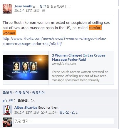 솔직히 말해서 어떤 나라를 미워할 수 있다는거. 그리고 한국도 그 예외가 아닐거라는거, 잘알고 있습니다. 하지만, 위안부 할머니들께 죄송한 만큼, 저는 일본인들 그리고 아무것도 모르는 미국인들이 와서 위안부는 창녀라고 말하는 걸 보면 정말 피가 거꾸로 솟습니다.