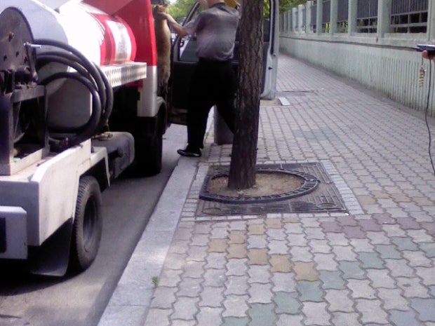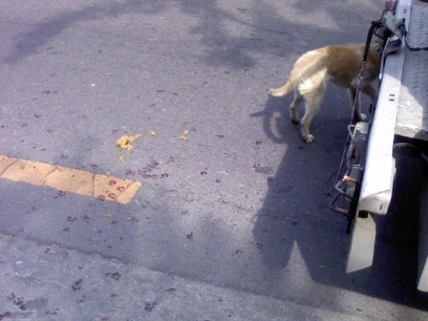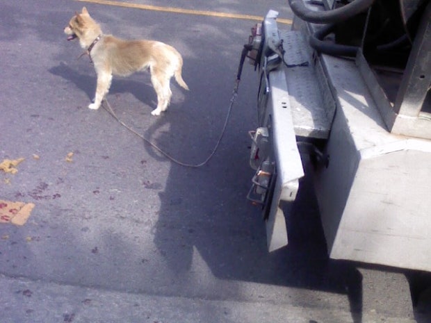 골목에서 나온 휘발유운반차량이 뒤에 강아지를 끈으로 목매단 채