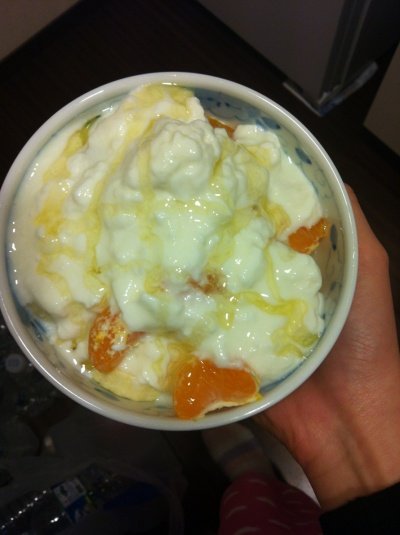 요즘 다이어트라 무지방 요플레에 꿀넣고 안에 바나나 귤 사과가 들어있답니당.ㅋ