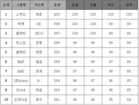 * 1순위인 가수를 400점기준으로 보고 평가를 매긴것입니다.