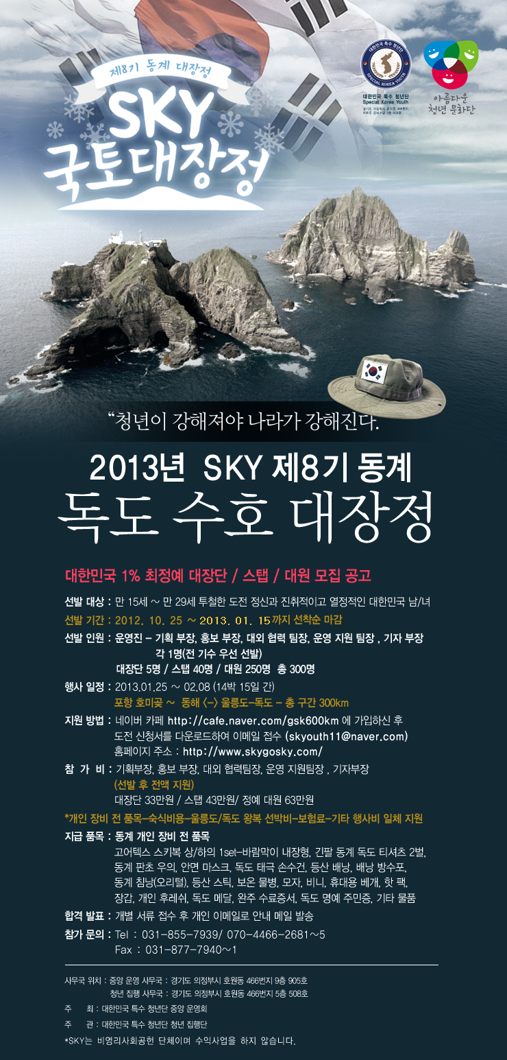 [출처] ◈◈[대장단/스탭/대원 모집]◈◈ 2013 제8기 SKY 독도수호 대장정 정예 스탭/ 대원(~01월 15일까지 접수) (SKY 국토대장정) |작성자 SKY중앙운영단