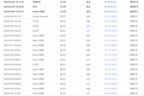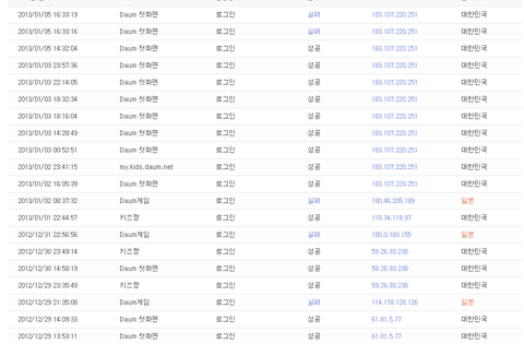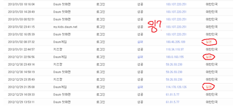 일단인사는짧게하겠습니다.예전에네이트에서본글중제가모르는사이로그인을다른사람이할수있다는글이생각나서다음아이디를확인해보려고로그인기록을확인했습니다