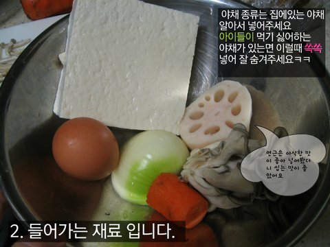 2.들어가는 재료 입니다. 야채 종류는 집에있는 야채 알아서 넣어주세요 아이들이 먹기 싫어하는 야채가 있는면 이럴때 쏙쏙 넣어 잘 숨겨주세요ㅋㅋ