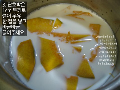 3. 단호박은 1cm 두께로 썰어 우유 한컵을 넣고 바글바글 끓여주세요