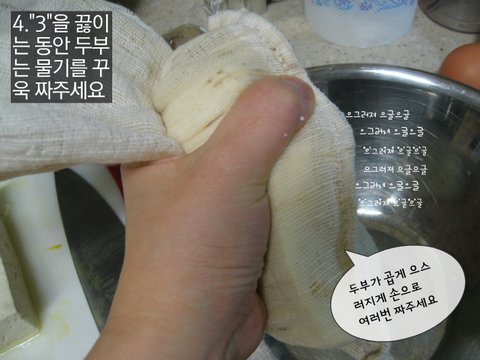 4. 3을 끓이는 동안 두부는 물기를 꾸욱 짜주세요 두부가 곱게 으스러지게 손으로 여러번 짜주세요
