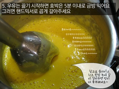 5. 그러는 동안 우유는 끓기 시작하면 호박은 5분 이내로 금방 익어요 그러면 핸드믹서로 곱게 갈아주세요