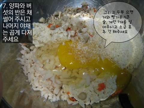 7. 양파와 버섯의 반은 채썰어 주시고 나머지 야채는 곱게 다져주세요 그리고 두부 으깬거와 빵가루 5큰술, 계란 1개를 넣어주시고 소금 후추 간 해주세요