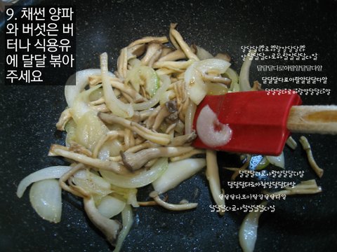 9. 채썬 양파와 버섯은 버터나 식용뷰에 달달 볶아주세요