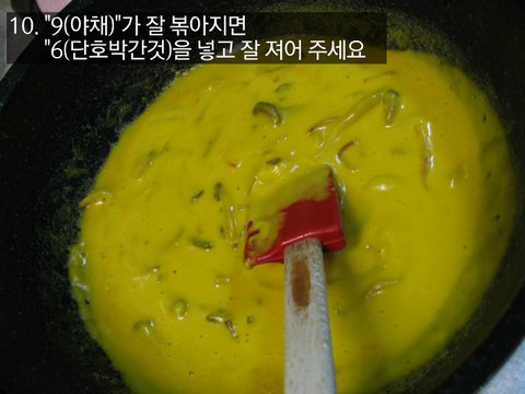 10. 9가 잘 볶아지면 6을 넣고 잘 져어 주세요