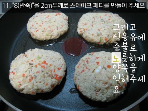 11. 8을 2cm두께로 스테이크 페티를 만들어 주세요 그리고 식용유에 중불로 노릇하게 양쪽을 익혀주세요