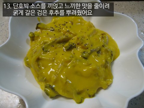 13. 단호박 소스를 끼얹고 느끼한 맛을 줄이려 굵게 갈은 검은 후추를 뿌려줬어요