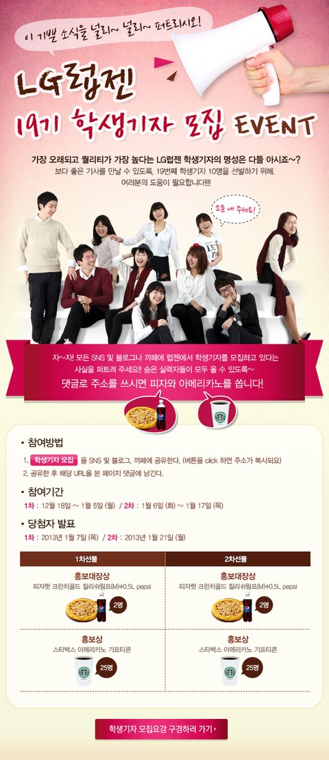 대기업 LG에서 학생 기자단을 뽑는다고 하네요 ㅎ.ㅎ 저도 참여해 볼라고 하는데 좋은 정보 많은 사람들이 알았음 좋겠네요 보고 관심있는 사람들은 지원해 보세요 ! 좋은 결과 기대할꼐요 ㅎ.ㅎ
