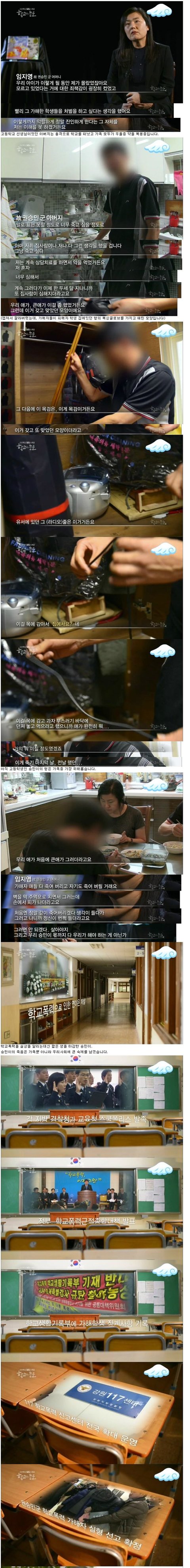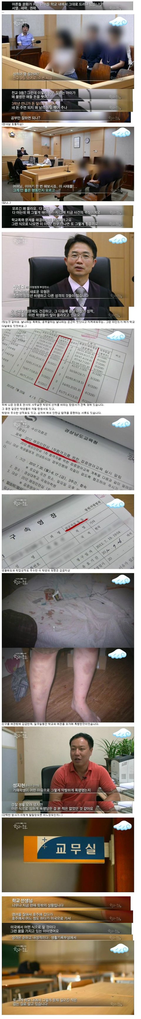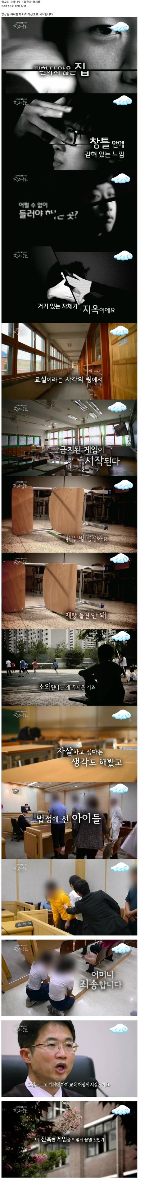 본인도 초등학생까지 왕따였어여 지금은 여중들어와서 괜찮은데 초딩때는 진짜 죽고싶고 맨날 학교가서 맞고울다왔어요 초1때부터 쭉 맞았거든요..학교에서 제일 덩치크고 뚱뚱한남자애한테 걔네친구들한테도 맞고그랬어요 그래서 맞고있기싫어서 태권도장다니는것도 한번 끊어봤는데 거기도 저 괴롭히던놈이 한둘있더라구요 거기서도 대놓고 저 한두대씩 퍽퍽때리고 계속 놀리면서 툭툭 발로차고 주먹으로 때리고 그러더라구요 그리고 그거 몇개월 해가지고는 쨉도안되던데요 뭐. 한대때렸다가 열대는더맞았어요 초5때인가 그쯤에 가슴 제대로 한번 맞았을때는 진짜 숨넘어가는줄알았어요 진짜 죽고싶어가지고 안아프게죽는법 그런거없나 인터넷 찾아보기도하고.. 초6때는 정말 큰맘먹고 학기끝나는김에 다 정리하자, 그래서 학교폭력신고? 그거 하려고했는데 담임선생님이 안됀다고 하지말라고하시더라고요. 한번은 친구가 교장한테 가보자그래서 철없이 교장한테갔다가 또 담임한테 엄청깨지고..초6때 교장이랑 담임이름 아직도생각납니다. 죽어버렸으면좋겠어요.. 저같이 아픈사람 더 안생겼으면좋겠어요. 저런 가해학생들 생기부에 빨간줄 쫙쫙긋고 벌 더 많이 센거줘야되요 아직도 초등학생때생각하면 힘든데 지금 저 프로그램에서나온 피해자애들은 얼마나힘들겠어요.. ㅡ ㅠㅠ베플감사합니다,,좋지않은일로 베플된거라 썩 기분이좋지는않지만 응원해주신분들 감사해요..저 앞으로 열심히살게요 진짜ㅠ