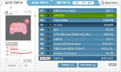 SM엔터테인먼트의 소녀시대의 I got a boy가 강북멋쟁이의 바로 밑에 위치되어있는 상황입니다.