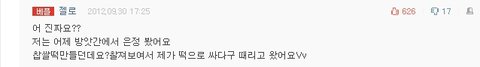 난 이것도 웃기던데 ㅋㅋㅋㅋㅋㅋㅋㅋㅋ 판 제목은 ☆★★☆사우나에서 지연을 봤음☆★★☆ ㅋㅋㅋ 이거였음 베플 ㅋ -------------------모바일 배려---------------------- 베플 젤로 어 진짜요??저는 어제 방앗간에서 은정 봤어요 찹쌀떡만들던데요?찰져보여서 제가 떡으로 싸다구 때리고왔어요Vv