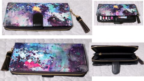 3. 몽환적인 느낌이 나게 디자인 해 보았습니다. 자석단추를 이용한 앞면을 열면 카드수납공간과 사진 수납 공간이 나오고 뒷면을 열면 2개의 지폐 수납공간과 동전주머니가 있습니다.