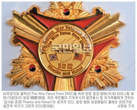 물론 정부차원에서도 한국전에 참전했던 외국군 참전용사들에게 감사의 의미를 담은 기념메달을 수여하고 있지만, 이번 기념메달은 비무장지대(DMZ)폐철조망을 녹여 특별 제작했다는 점에서 그 의미가 큼