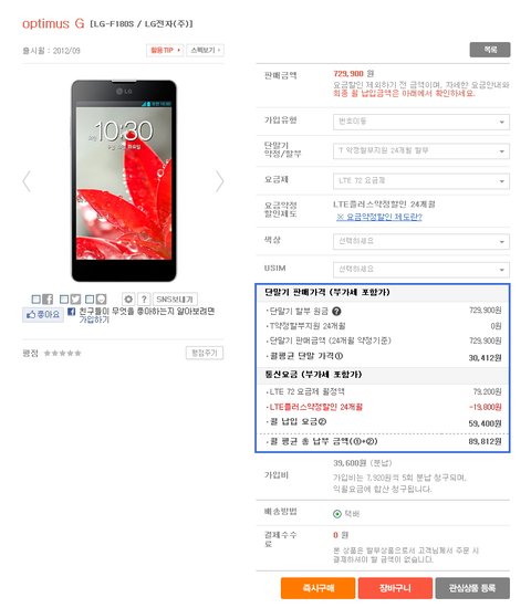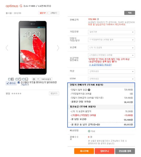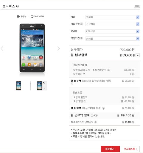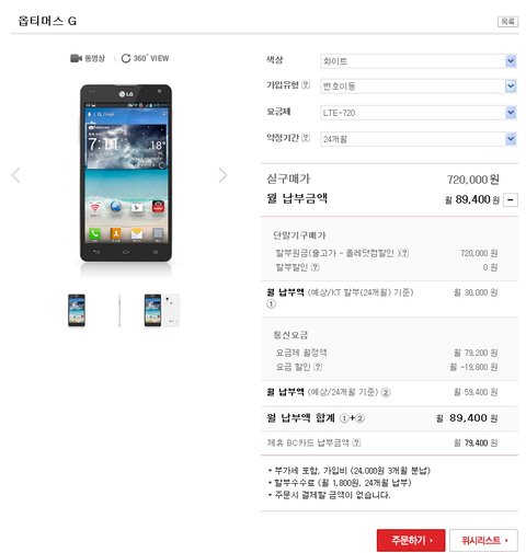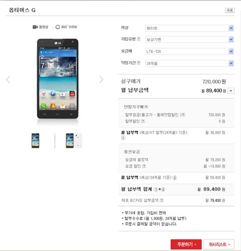 3사 통신사 온라인 공식몰에서 해본 옵티머스 G 가격비교~현재기준이고요 72요금제로 했어요 ^^