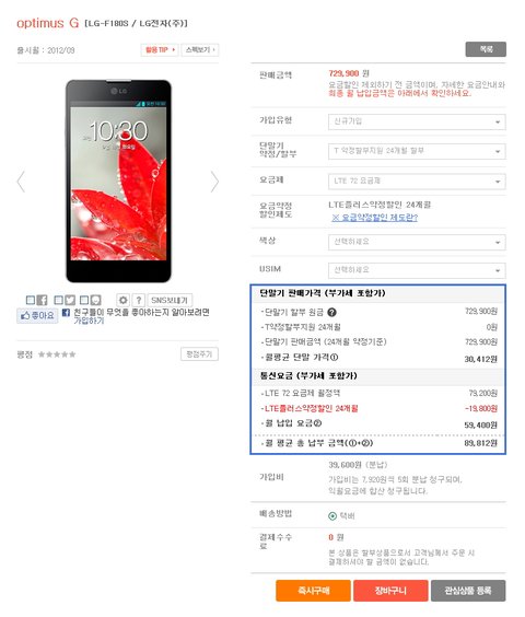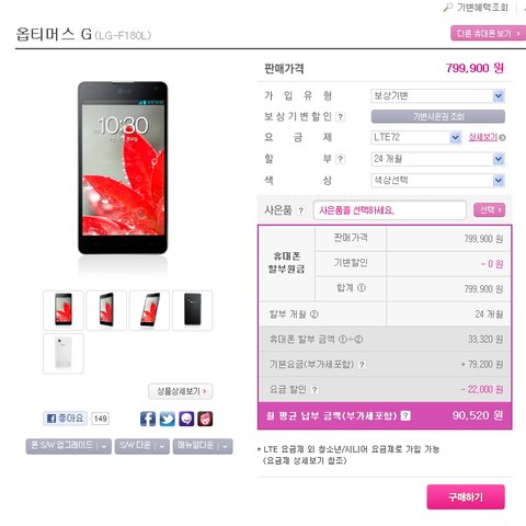 통신사들이 직접 하는 공식쇼핑몰에서 옵티머스 G가격 알아봤네요