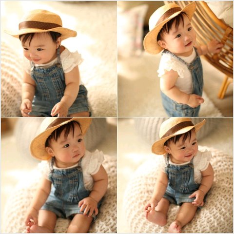 처음으로 청멜빵바지를 입어본 보윤이! 밀짚모자 쓰니 남자아기 같네요!